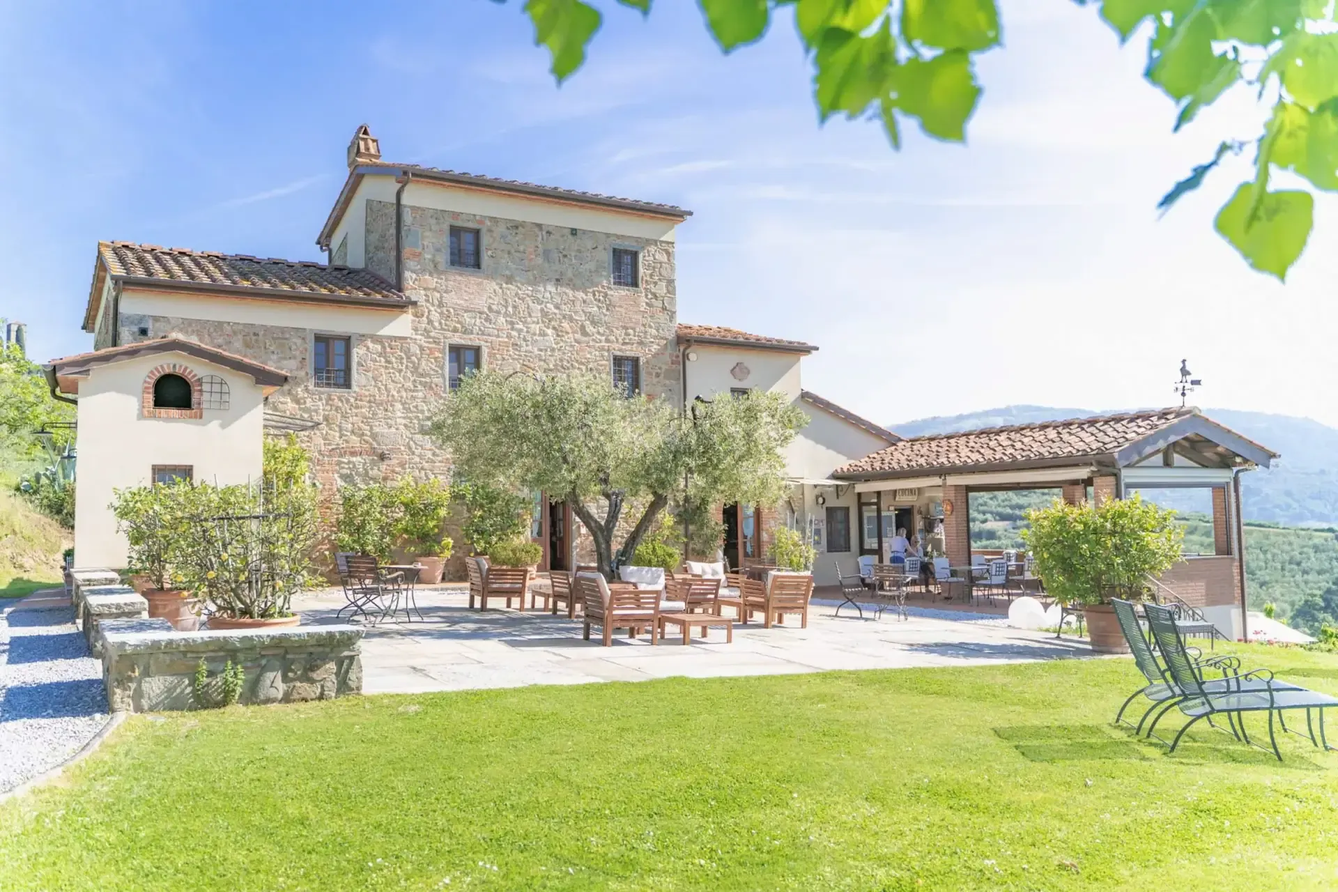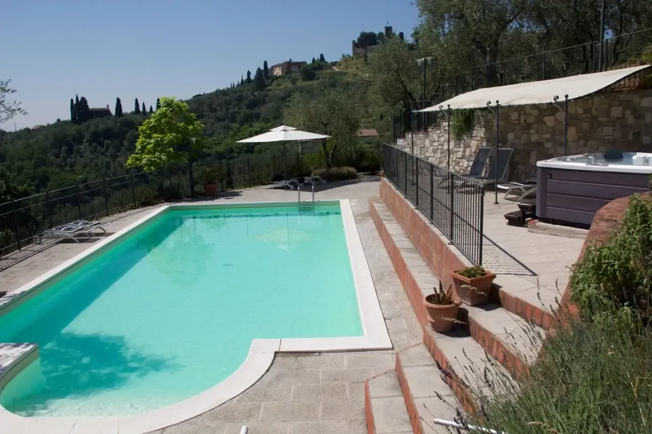Posizionata tra gli Ulivi c’è la nostra grande piscina con una distesa d’erba dove potete godervi il sole. Abbiamo una cantina di vini con ampia scelta dei tipici vini toscani. Sulla terrazza panoramica al mattino si può fare la colazione e alla sera sedersi insieme e gustare un buon bicchiere divino. Inoltre nella sala camino potete sedervi in tranquillità a leggere un buon libro.